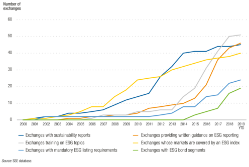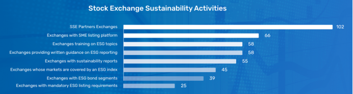 SSE倡議關(guān)注的交易所可持續(xù)發(fā)展活動(dòng)主要包括但不限于是否支持中小企業(yè)上市板塊、交易所培訓(xùn)是否包含ESG要素、交易所是否出臺(tái)ESG披露指引、交易所自身是否發(fā)布可持續(xù)發(fā)展報(bào)告、交易所是否有ESG指數(shù)交易產(chǎn)品及交易、交易所對(duì)上市企業(yè)規(guī)則中是否有針對(duì)ESG要素的要求。