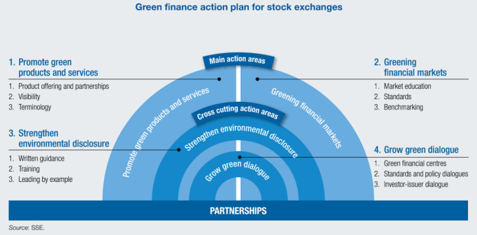 可持續(xù)交易所的概念最早是由聯(lián)合國(guó)貿(mào)發(fā)會(huì)議(UNCTAD)、聯(lián)合國(guó)全球契約(UN Global Impact)、聯(lián)合國(guó)環(huán)境規(guī)劃署金融倡議(UNEP FI)和聯(lián)合國(guó)負(fù)責(zé)任投資(UN PRI)于2009年提出,并以此發(fā)起了可持續(xù)交易所(Sustainable Stock Exchange, SSE)倡議。SSE致力于提供一個(gè)全球共享平臺(tái),通過(guò)聯(lián)結(jié)全球的交易所探討如何通過(guò)投資者,公司(發(fā)行人),監(jiān)管機(jī)構(gòu),政策制定者和相關(guān)國(guó)際組織合作與交流有效提高環(huán)境(Environmental),社會(huì)(Social)和公司治理(Governance)的績(jī)效和可持續(xù)投資,以及提高包含但不限于聯(lián)合國(guó)可持續(xù)發(fā)展目標(biāo)(SDGs)等可持續(xù)投資的資金籌措。