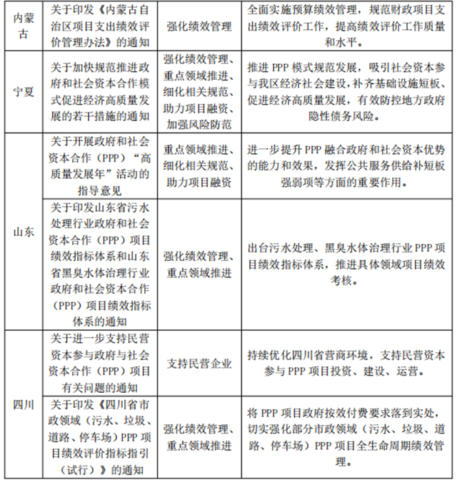 地方層面,同樣在加強績效管理、支持民營企業(yè)、示范案例推廣、細化相關(guān)規(guī)范、推動項目融資、重點領(lǐng)域推進、規(guī)范第三方服務(wù)等方面推動PPP模式在各省市的應(yīng)用及推廣。北京、江蘇等省市發(fā)布PPP項目績效管理相關(guān)通知規(guī)范PPP項目全生命周期績效管理,提高公共服務(wù)供給效能,保障合作各方合法權(quán)益,進一步提升PPP項目管理水平。四川發(fā)布文件支持民營資本參與PPP項目投資、建設(shè)、運營。江蘇發(fā)布文件組織申報2020年度省級PPP示范項目,推進PPP工作高質(zhì)量發(fā)展,加強示范引領(lǐng)和樣板推廣,帶動更多生態(tài)環(huán)保等綠色PPP項目落地實施。寧夏、山東等省市發(fā)布文件細化相關(guān)規(guī)定、優(yōu)化審批流程與項目實施,加強項目庫管理制度等制度建設(shè)。北京、廣西等省市發(fā)布文件通過發(fā)行債券、資產(chǎn)證券化、REITs等方式助力PPP項目融資及再融資業(yè)務(wù)。河北、四川等省市發(fā)布文件,在污水處理、垃圾處理、綠色社區(qū)改造等綠色領(lǐng)域推廣運用PPP模式。