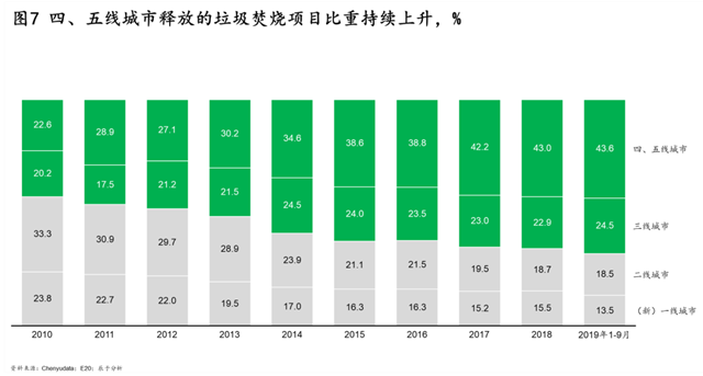 二是四、五線城市釋放的垃圾焚燒項目比例越來越高。目前,(新)一線、二線、三線城市的項目增速都在放緩甚至下降,未來5~10年最大的增長將是四、五線城市。例如,2019年四、五線城市的垃圾焚燒項目占比高達43.6%,同期的新一、二線城市則分別只占到13.5%和18.5%(見圖7)。