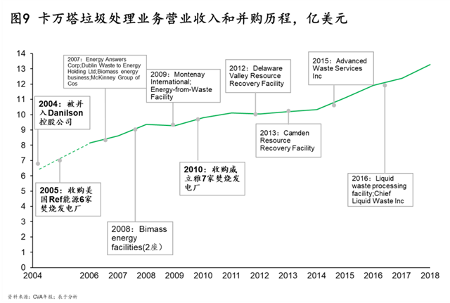 發(fā)達國家的成熟市場經驗表明,環(huán)保政策和行業(yè)標準的趨嚴會推動行業(yè)整合。例如在美國,自20世紀90年代以來,一系列針對垃圾焚燒行業(yè)的細化標準不斷出臺,大量中小型公司受到嚴峻考驗,擁有技術優(yōu)勢的卡萬塔通過并購持續(xù)提高市場份額,現已成為美國最大的垃圾焚燒發(fā)電投資商,占據高達67%的市場份額(見圖9)。