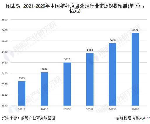 隨著我國秸稈垃圾處理的利用率的不斷提升及技術水平的不斷進步,前瞻認為,未來秸稈垃圾處理行業(yè)的市場規(guī)模將保持一個穩(wěn)定增長的態(tài)勢,預計到2026年,整個行業(yè)的市場規(guī)模將達到3475億元。