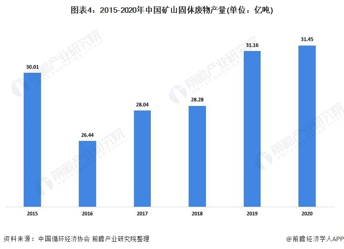 2020年中國礦上固體廢物產(chǎn)量為31.45億噸,2015-2020年產(chǎn)量的復(fù)合年增長率為0.9%。整體來看,近年來礦上固體廢物產(chǎn)量基本保持穩(wěn)定。