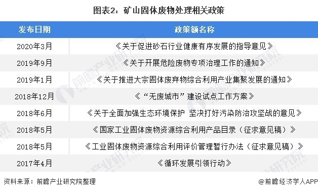 為了消除礦山固體廢物導(dǎo)致的污染,政府現(xiàn)積極推動綜合利用礦山固體廢物。固廢處理行業(yè)作為保護生態(tài)平衡、實現(xiàn)可循環(huán)經(jīng)濟的重要推動力量,與之相關(guān)的國家政策頻頻發(fā)布。