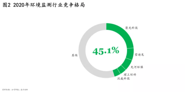 過去幾年內(nèi),國內(nèi)設(shè)備企業(yè)強勢擴張,市場份額持續(xù)提升。外資企業(yè)雖有技術(shù)優(yōu)勢,但由于我國對相關(guān)設(shè)備國產(chǎn)化的支持,加之國內(nèi)企業(yè)自身的技術(shù)進步,優(yōu)勢不斷下滑??梢钥吹?,為加快環(huán)境監(jiān)測設(shè)備國產(chǎn)化步伐,國家出臺多項政策,如《空氣質(zhì)量新標準第二階段監(jiān)測實施方案》、《生態(tài)環(huán)境監(jiān)測網(wǎng)絡(luò)建設(shè)方案》等,鼓勵國內(nèi)科研部門和相關(guān)企業(yè)研發(fā)具有自主知識產(chǎn)權(quán)的環(huán)境監(jiān)測儀器設(shè)備,規(guī)定政府在滿足需求的條件下優(yōu)先使用國產(chǎn)設(shè)備。第三方運維企業(yè)以小規(guī)模居多,受數(shù)據(jù)造假、運維不規(guī)范、信任危機等一系列問題影響,部分被淘汰出局。截至2020年,我國環(huán)境監(jiān)測CR5為45.1%(如圖2),行業(yè)集中度較高。