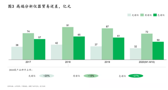 其一,自動監(jiān)測對儀器設(shè)備提出了更高的要求,外資企業(yè)重獲競爭力。當前我國分析儀器仍依賴進口,近兩年來貿(mào)易逆差雖有所降低,但依然存在數(shù)十億的差距(如圖3)。2018年,光譜儀、質(zhì)譜儀、色譜儀的國產(chǎn)品牌市占率約為20%、15%、27%,差距仍然較大。