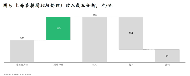 由于沼氣、粗油脂等資源化產(chǎn)物產(chǎn)量少、應用有限,在當前技術工藝下,餐廚垃圾處理的資源化價值很難獲得規(guī)模性與經(jīng)濟性,商業(yè)模式尚未完全走順暢。目前我國政府對餐廚垃圾企業(yè)實行運行補貼和收運補貼,具體金額大小受技術、地區(qū)、試點發(fā)展過程、項目處理量等因素影響。調(diào)研發(fā)現(xiàn),由于資源化產(chǎn)品盈利有限,難以覆蓋全部成本,餐廚垃圾處理企業(yè)的盈利當前主要依靠政府補貼(見圖5)。
