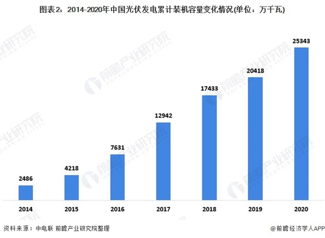 截至2020年底,我國太陽能發(fā)電累計裝機容量達25343萬千瓦,較2019年增加了4925萬千瓦,同比增長24.1%。