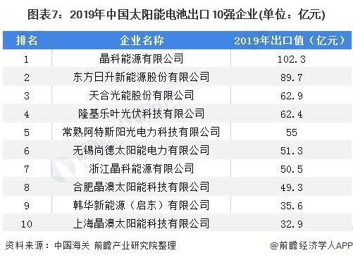 根據(jù)《中國海關(guān)》雜志2020年4月刊公布數(shù)據(jù)顯示,多家光伏企業(yè)躋身2019年出口前200強。其中晶科能源有限公司以102.3億元的出口值排名太陽能電池出口企業(yè)第一名;東方日升能源股份有限公司排名第二,出口值為89.7億元;天合光能股份有限公司排名第三,出口值為62.9億元。