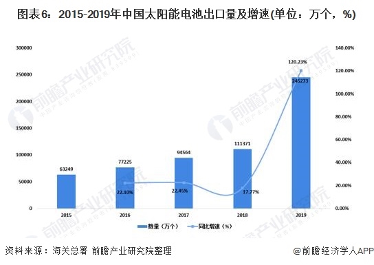 在出口方面,2015-2019年我國太陽能電池出口數(shù)量逐年增加。根據(jù)海關(guān)總署數(shù)據(jù)顯示,2015年我國太陽能電池出口數(shù)量僅有63249萬個,到了2019年增加到245273萬個,較2018年同比增長120.23%。出口規(guī)模及增速均創(chuàng)2012年歐美挑起“雙反”以來的新高