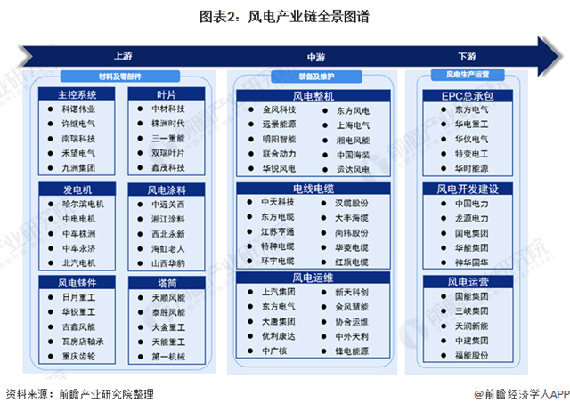 中游整機(jī)環(huán)節(jié)的金風(fēng)科技、明陽(yáng)智能、遠(yuǎn)景能源、聯(lián)合動(dòng)力、上海電氣等,風(fēng)電電纜環(huán)節(jié)的中天科技、哦東方電纜等;風(fēng)電運(yùn)維環(huán)節(jié)的大唐集團(tuán)、中廣核等;