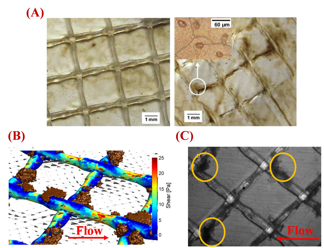 本文首先總結(jié)了該領(lǐng)域常用的研究方法,包括水力學(xué)實(shí)驗(yàn)、膜污染實(shí)驗(yàn)和計(jì)算流體力學(xué)(CFD)模擬。水力學(xué)實(shí)驗(yàn)和膜污染實(shí)驗(yàn)主要采用錯(cuò)流過(guò)濾裝置(圖4A),且保證進(jìn)水隔網(wǎng)與膜面緊貼,以更好地模擬流體在卷式膜組件中的行為。流道壓降差(FCP drop)是衡量進(jìn)水隔網(wǎng)性能的重要參數(shù),也是水力學(xué)實(shí)驗(yàn)主要的測(cè)試指標(biāo)之一,對(duì)其的測(cè)量也從最初的U型管到如今的高精度壓差傳感器。膜污染實(shí)驗(yàn)主要指生物污染實(shí)驗(yàn),近些年研究者們開(kāi)始更多關(guān)注流道內(nèi)生物污染的動(dòng)態(tài)發(fā)展過(guò)程,這得益于實(shí)時(shí)原位觀測(cè)技術(shù)的發(fā)展,如PIV(圖4B)、OCT(圖4C)、NMR等,其中NMR已可以被運(yùn)用于工業(yè)級(jí)別的卷式膜組件中流態(tài)和膜污染的實(shí)時(shí)原位觀測(cè)。CFD模擬也歷經(jīng)了從早期的簡(jiǎn)單流態(tài)模擬,到后來(lái)耦合了傳質(zhì)、無(wú)機(jī)污染甚至生物污染的復(fù)雜模型的變化,模型的驗(yàn)證主要通過(guò)流道壓降差的測(cè)定或和原位觀測(cè)的流場(chǎng)進(jìn)行比對(duì)來(lái)完成。