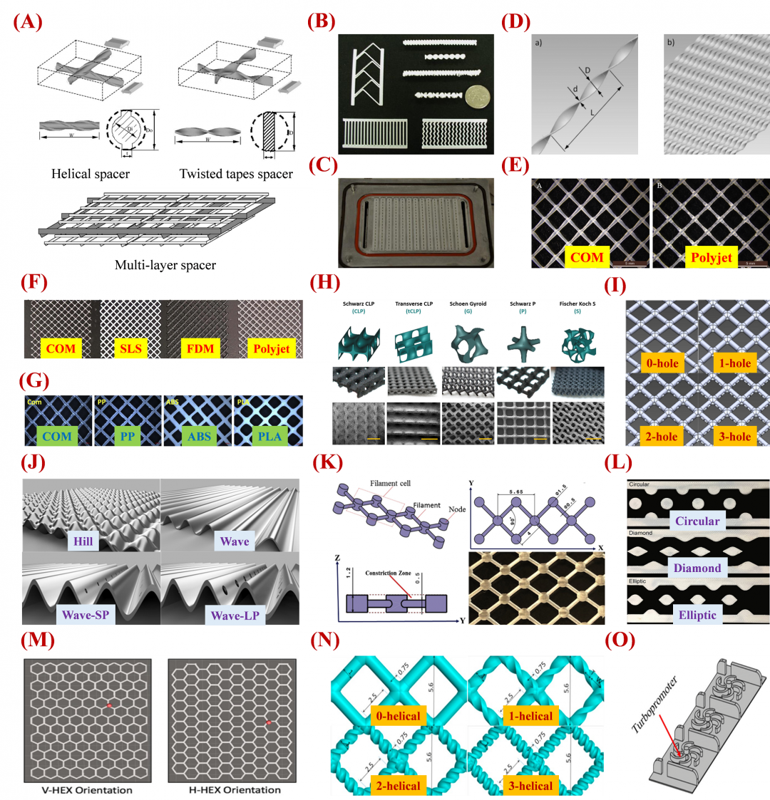 近些年,研究者們?cè)谶M(jìn)水隔網(wǎng)的改進(jìn)上做了一些嘗試和探究,主要包括:(1)改進(jìn)表面材質(zhì)。例如,在進(jìn)水隔網(wǎng)表面進(jìn)行親水改性、涂敷抗菌組分等。(2)優(yōu)化幾何構(gòu)型。例如,采用高精度3D打印技術(shù)制造新型構(gòu)型的進(jìn)水隔網(wǎng)(圖7)。雖然這些改進(jìn)大多在實(shí)驗(yàn)室取得了良好的水力學(xué)性能和抗污染性能,但考慮到實(shí)際應(yīng)用,還存在諸多問(wèn)題。例如,涂覆層組分在長(zhǎng)期運(yùn)行中的穩(wěn)定性以及有毒物質(zhì)泄露到環(huán)境的風(fēng)險(xiǎn);3D打印技術(shù)的規(guī)模、打印速度和成本問(wèn)題;新型構(gòu)型能否適用于卷式膜元件和長(zhǎng)期高壓條件等。德國(guó)Lanxess 公司開(kāi)發(fā)的ASD(alternating strand design)進(jìn)水隔網(wǎng)可能是更適用于實(shí)際的新型構(gòu)型;Lin等在2020年Water Research上發(fā)表的文章(清華大學(xué)黃霞團(tuán)隊(duì)WR:變徑網(wǎng)絲進(jìn)水隔網(wǎng)幾何特征對(duì)膜元件的水力學(xué)和抗污染性能的影響探究)也指出變徑網(wǎng)絲構(gòu)型進(jìn)水隔網(wǎng)在水力學(xué)性能和抗污染性能上具有優(yōu)勢(shì),今后可以在此基礎(chǔ)上開(kāi)展進(jìn)一步的優(yōu)化。