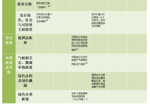 兩個(gè)中等偏上收入的國(guó)家,在生態(tài)基礎(chǔ)設(shè)施和污染治理的基礎(chǔ)上,將財(cái)政刺激更多地傾斜于可再生能源發(fā)展和新能源車補(bǔ)貼。對(duì)新能源汽車行業(yè)的支持同時(shí)也包括了在購(gòu)買、生產(chǎn)和投資方面的稅收優(yōu)惠。在貨幣政策和金融監(jiān)管方面,中國(guó)央行將綠色債券和綠色貸款納入央行貸款便利的合格抵押品框架,計(jì)劃開始進(jìn)行氣候風(fēng)險(xiǎn)壓力測(cè)試,同時(shí)發(fā)布了《綠色債券支持項(xiàng)目目錄(2021年版)》對(duì)綠色債券市場(chǎng)進(jìn)行了進(jìn)一步規(guī)范和指導(dǎo)。