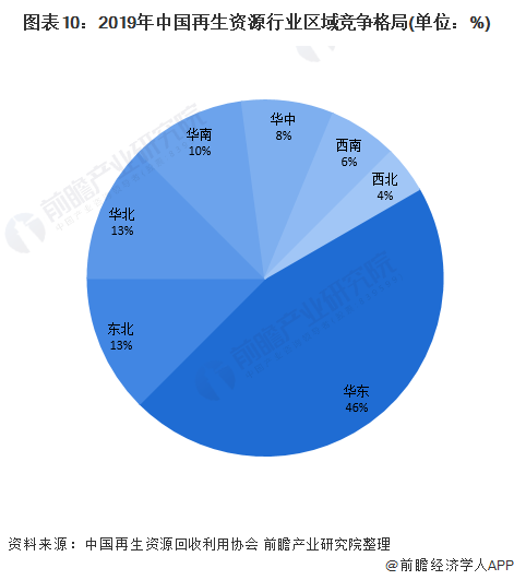 在區(qū)域競爭格局方面,從2019年我國再生資源行業(yè)50強企業(yè)的注冊地分布來看,華東地區(qū)的上榜企業(yè)數(shù)量最多,占比達(dá)46%,其中江蘇省的競爭實力最強。