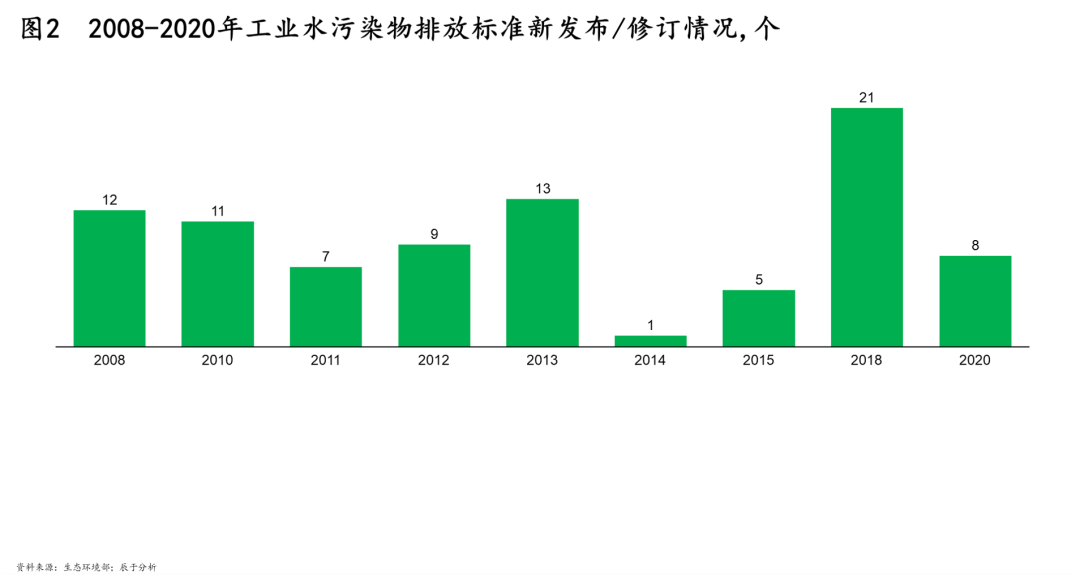 二是排放標(biāo)準(zhǔn)趨嚴(yán),自行處理難度加大。中央環(huán)保督察已完成全覆蓋,最新的第二輪、第三批下沉工作任務(wù)也已基本完成,8個(gè)中央生態(tài)環(huán)境保護(hù)督察組于2021年4月6日至4月9日陸續(xù)進(jìn)駐8個(gè)省(區(qū))開(kāi)展督察。此外,我國(guó)自2008年起持續(xù)發(fā)布及修訂了包括造紙、化工等行業(yè)在內(nèi)的水污染物排放標(biāo)準(zhǔn),不斷收緊水污染物排放的限值(如圖2)。過(guò)去,部分企業(yè)內(nèi)部的廢水處理設(shè)施處于非正常運(yùn)行狀態(tài),開(kāi)工率低、處理質(zhì)量低,不利于達(dá)標(biāo)排放,第三方運(yùn)營(yíng)的重要性日漸凸顯。