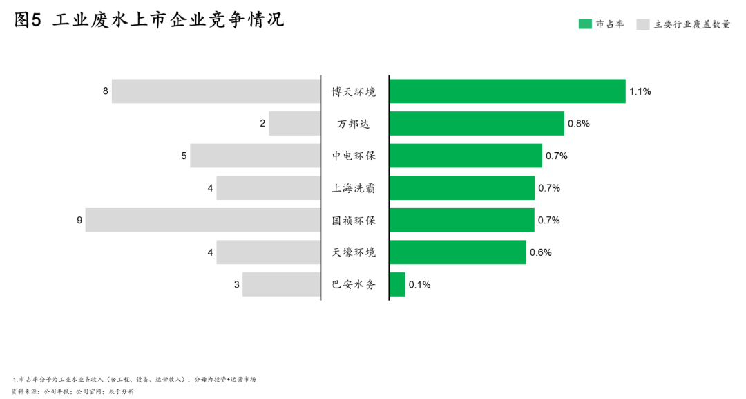 不同行業(yè)廢水的處理方式大不相同,且存在較高的技術(shù)壁壘,工業(yè)廢水治理企業(yè)通常只能專注于某一個(gè)或某幾個(gè)細(xì)分領(lǐng)域,導(dǎo)致當(dāng)前行業(yè)競(jìng)爭(zhēng)格局分散,頭部企業(yè)市場(chǎng)占有率偏低,“小而散”是主流狀態(tài)(如圖5)。