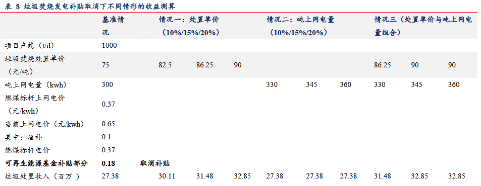 對補貼取消、參與CCER模擬不同價格情形進行測算,單噸發(fā)電量從300kwh提升至360kwh(增加20%),處置單價由75元/噸提升至90元/噸(增加33.33%),CCER交易價格為50元/噸時,可基本對沖可再生能源基金補貼退坡影響。