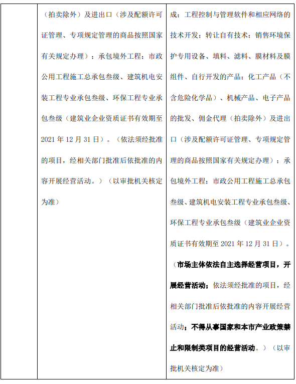 變更后公司經營范圍為:環(huán)境保護設施運營;環(huán)境保護技術、水處理及污水處理技術、苦咸水及海水淡化技術、水及水中價值物再生回用和資源化技術、環(huán)保節(jié)能技術、生態(tài)修復技術、物聯網、大數據、云計算的技術開發(fā)、技術推廣、技術轉讓、技術咨詢、技術服務;信息系統(tǒng)集成服務;通訊設備銷售;計算機、軟件及輔助設備批發(fā);地理遙感信息服務;軟件銷售;技術推廣服務;基礎軟件服務,應用軟件服務(不含醫(yī)用軟件)、軟件開發(fā);機電設備安裝;工程工藝設計;建設工程項目管理;計算機系統(tǒng)集成;工程控制與管理軟件和相應網絡的技術開發(fā);轉讓自有技術;銷售環(huán)境保護專用設備、填料、濾料、膜材料及膜組件、自行開發(fā)的產品;化工產品(不含危險化學品)、機械產品、電子產品的批發(fā)、傭金代理(拍賣除外)及進出口(涉及配額許可證管理、專項規(guī)定管理的商品按照國家有關規(guī)定辦理);承包境外工程;市政公用工程施工總承包叁級、建筑機電安裝工程專業(yè)承包叁級、環(huán)保工程專業(yè)承包叁級(建筑業(yè)企業(yè)資質證書有效期至 2021 年 12 月 31 日)。(市場主體依法自主選擇經營項目,開展經營活動;依法須經批準的項目,經相關部門批準后依批準的內容開展經營活動;不得從事國家和本市產業(yè)政策禁止和限制類項目的經營活動。)