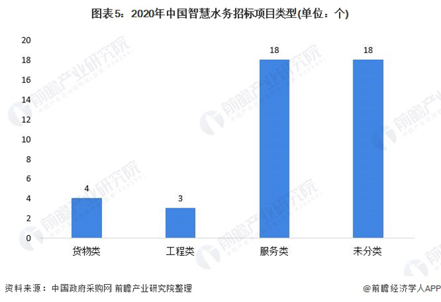 從項(xiàng)目類型來看,我國(guó)智慧水務(wù)項(xiàng)目采購(gòu)內(nèi)容包括貨物類、工程類和服務(wù)類。2020年,我國(guó)智慧水務(wù)招標(biāo)項(xiàng)目中貨物類項(xiàng)目4個(gè),工程類項(xiàng)目3個(gè),服務(wù)類項(xiàng)18個(gè),未分類項(xiàng)目18個(gè)。