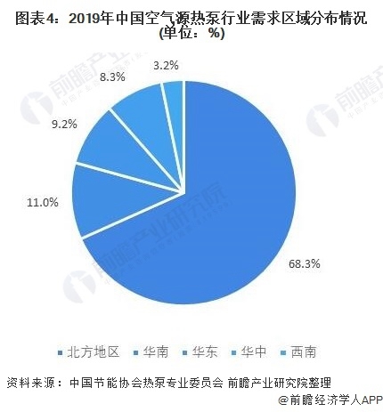 從需求來看,2019年北方地區(qū)(華北、東北、西北)市場規(guī)模進一步擴大,占比為68.3%,華南地區(qū)規(guī)模占比11.0%,較去年下滑3.6個百分點,熱泵企業(yè)將更多的精力投入到熱水渠道重建之后,在熱水行業(yè)普遍滑落的背景下,地區(qū)整體下滑幅度相對較小。