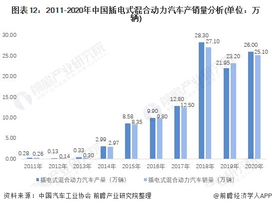 2011-2018年我國(guó)插電式混合動(dòng)力汽車產(chǎn)銷量呈逐年增長(zhǎng)趨勢(shì),但從2019年開始隨著我國(guó)純電動(dòng)汽車技術(shù)逐漸成熟,外加補(bǔ)貼減少等原因?qū)е挛覈?guó)插電式混合動(dòng)力汽車出現(xiàn)下降,2020年雖有回彈但仍沒有增長(zhǎng)到2018年的峰值。