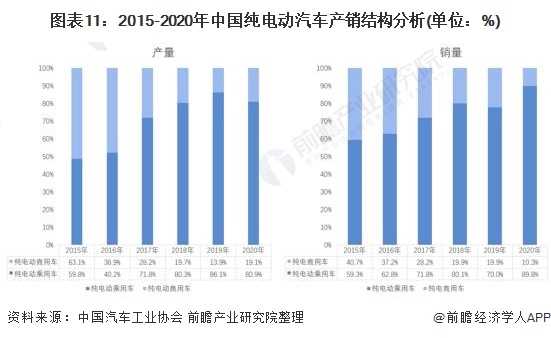 純電動(dòng)汽車使用電能,省去可傳統(tǒng)燃油汽車的發(fā)動(dòng)機(jī)、變速箱等零部件,使得整個(gè)車身結(jié)構(gòu)較為簡(jiǎn)單,也減少了汽車保養(yǎng)的費(fèi)用,同時(shí)電費(fèi)相較于燃油費(fèi)要便宜的多,因此受到廣大車主的青睞。2020年我國(guó)純電動(dòng)乘用車產(chǎn)量開始下降但銷量開始回升,2020年我國(guó)純電動(dòng)乘用車產(chǎn)量和銷量分別占純電動(dòng)汽車產(chǎn)銷量的80.9%和89.8%。