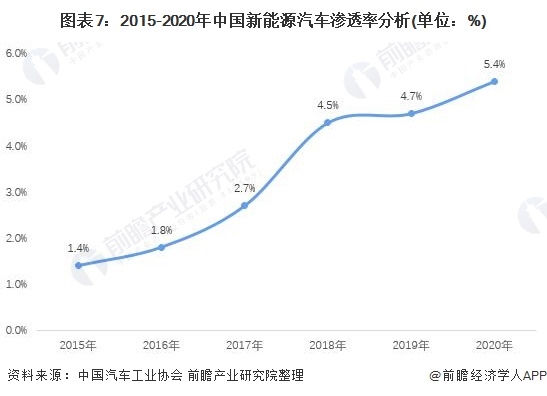 根據(jù)中國(guó)汽車工業(yè)協(xié)會(huì)最新公布的數(shù)據(jù)顯示,2020我國(guó)新能源汽車市場(chǎng)滲透率(全國(guó)新能源汽車銷量占全國(guó)汽車總銷量比例)達(dá)到5.4%,較2019年增長(zhǎng)0.7個(gè)百分點(diǎn)。