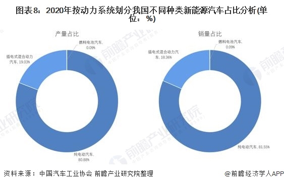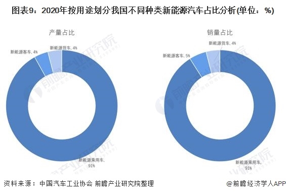 按動(dòng)力系統(tǒng)對(duì)我國(guó)的新能源汽車進(jìn)行劃分,純電動(dòng)汽車是我國(guó)產(chǎn)銷最多的新能源汽車種類。2020年純電動(dòng)汽車產(chǎn)量占我國(guó)新能源汽車總產(chǎn)量的80.88%,銷量占我國(guó)新能源汽車總銷量的81.55%。按用途劃分,新能源乘用車是我國(guó)產(chǎn)銷均占全國(guó)產(chǎn)銷的91%左右,是按用途劃分占我國(guó)新能源汽車最多的類型。