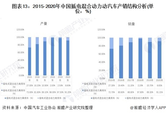 從插電式混合動(dòng)力汽車的用途來看2015-2018年,我國(guó)插電式混合動(dòng)力乘用車產(chǎn)銷占我國(guó)插電式混合動(dòng)力汽車產(chǎn)銷量?jī)奢喌谋壤手鹉晟鲜汹厔?shì),但從2019年開始下降,主要原因在于我國(guó)純電動(dòng)汽車的技術(shù)逐漸成熟,續(xù)航里程增強(qiáng)導(dǎo)致車主們會(huì)選擇更為經(jīng)濟(jì)實(shí)惠的純電動(dòng)汽車代替插電式混合動(dòng)力汽車。
