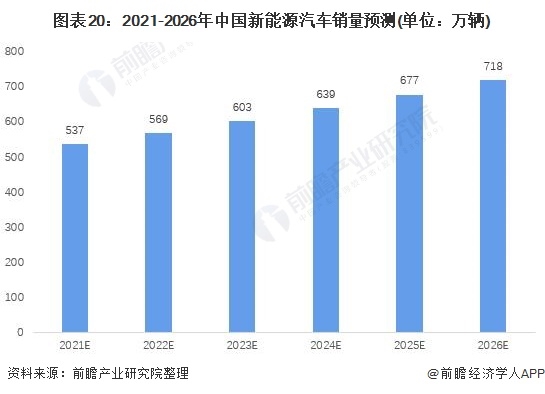 根據(jù)《新能源汽車產(chǎn)業(yè)發(fā)展規(guī)劃(2021-2035年)》中提到,到2025年我國(guó)新能源汽車的銷售量占汽車新車銷售總量的20%左右。根據(jù)中國(guó)汽車工業(yè)協(xié)會(huì)數(shù)據(jù)顯示,2020年我國(guó)汽車銷量達(dá)到2531.1萬輛,根據(jù)往年數(shù)據(jù)和未來我國(guó)經(jīng)濟(jì)發(fā)展趨勢(shì)來看,前瞻預(yù)計(jì)未來我國(guó)汽車銷量將以每年6%的增速進(jìn)行增長(zhǎng),到2026年我國(guó)汽車新車銷售量約為3590萬輛,而新能源汽車銷量按2025年的20%來推算,約能達(dá)到718萬輛左右。
