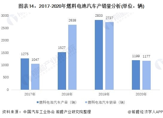 2017-2020年我國(guó)燃料電池汽車的產(chǎn)銷量呈波動(dòng)變化趨勢(shì)。2020年我國(guó)燃料電池汽車的產(chǎn)銷量分別為1199輛和1177輛,分別較2019年下降57.68%和57.00%。燃料電池汽車的主要應(yīng)用領(lǐng)域?yàn)槿剂想姵乜蛙嚕?020年我國(guó)燃料電池客車占我國(guó)燃料電池車輛走總產(chǎn)量的93.26%。