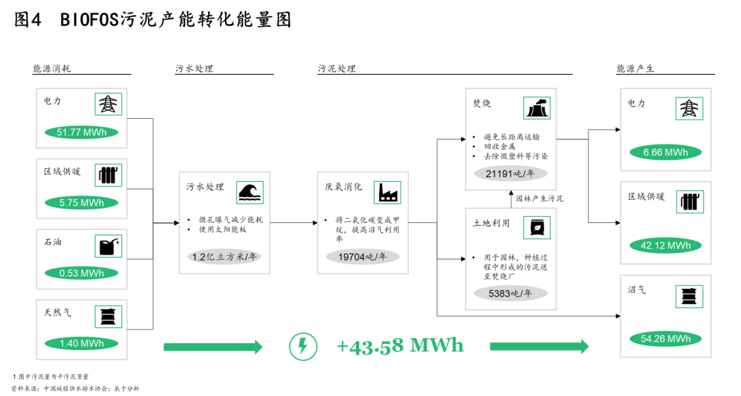 其二,30●60雙碳目標(biāo)提出后,未來(lái)污泥處理處置將以節(jié)能降耗及能源資源回收為目標(biāo),這對(duì)污泥處理提出了更為清晰的技術(shù)路徑方向。例如在能源回收上,厭氧消化是優(yōu)選途徑,如丹麥污水廠BIOFOS通過(guò)污泥消化產(chǎn)能實(shí)現(xiàn)能量盈余(見(jiàn)圖4)。