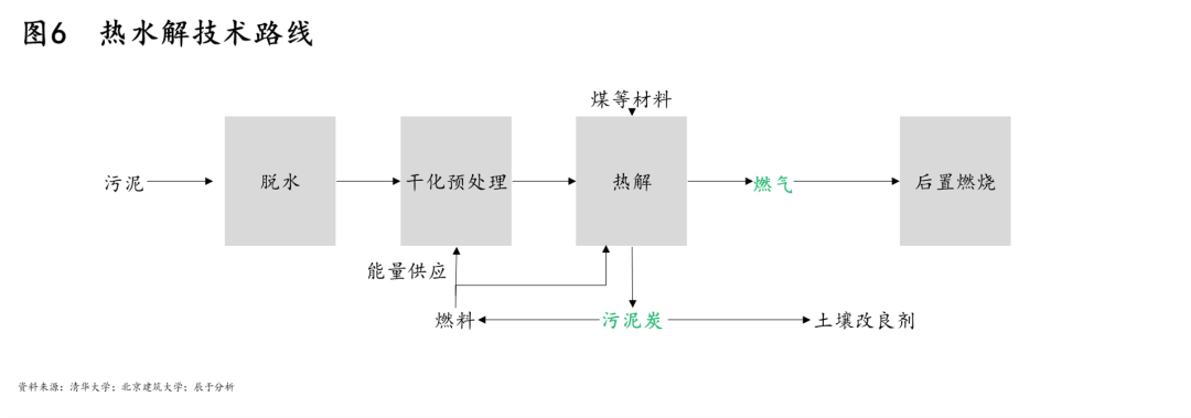 而在資源回收上,相比好氧堆肥,干化焚燒及熱水解則是更好的資源化方式,值得重點(diǎn)關(guān)注。干化焚燒的技術(shù)路線如圖5所示,作為快捷、徹底實(shí)現(xiàn)污泥減量化、穩(wěn)定化、無(wú)害化的最終處置技術(shù),干化焚燒后的資源化利用產(chǎn)品也更易走通;熱水解的技術(shù)路線如圖6所示,其生產(chǎn)過(guò)程清潔化,生成的污泥炭資源多樣化。