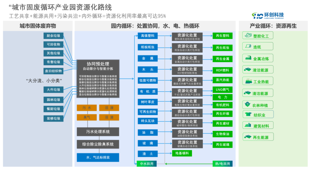 而集中協(xié)同多種城市固廢的循環(huán)產(chǎn)業(yè)園,則在資源化處置的同時(shí),實(shí)現(xiàn)“工藝設(shè)備共享、能源資源共享、污染共治”的集約化和規(guī)?;?yīng),節(jié)能減排效果更加顯著。