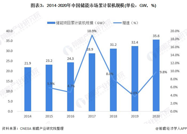 由于儲能在清潔利用方面的重要作用,近年來,我國儲能項(xiàng)目裝機(jī)規(guī)模穩(wěn)步增長。根據(jù)中關(guān)村儲能產(chǎn)業(yè)技術(shù)聯(lián)盟(CNESA)統(tǒng)計(jì),截至2020年底,我國已投運(yùn)儲能項(xiàng)目累計(jì)裝機(jī)規(guī)模為35.6GW,占全球市場總規(guī)模的18.6%,同比增長9.8%。
