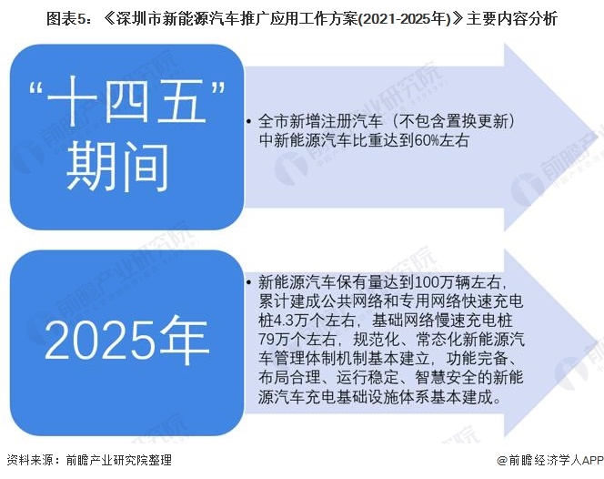 為推動新能源汽車的發(fā)展,深圳市做出了明晰的發(fā)展規(guī)劃。2021年3月頒布《深圳市新能源汽車推廣應用工作方案(2021-2025年)》,政策表明“十四五”期間,全市新增注冊汽車(不包含置換更新)中新能源汽車比重達到60%左右,至2025年,新能源汽車保有量達到100萬輛左右,累計建成公共網絡和專用網絡快速充電樁4.3萬個左右,基礎網絡慢速充電樁79萬個左右,規(guī)范化、常態(tài)化新能源汽車管理體制機制基本建立,功能完備、布局合理、運行穩(wěn)定、智慧安全的新能源汽車充電基礎設施體系基本建成。