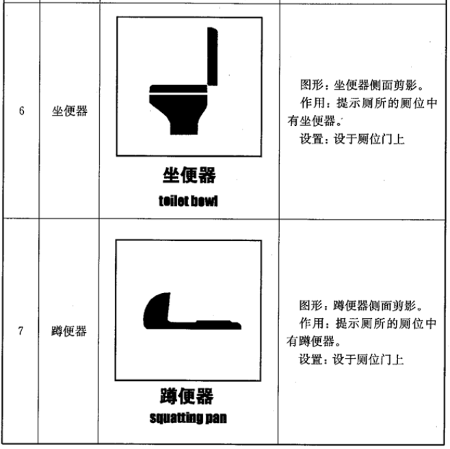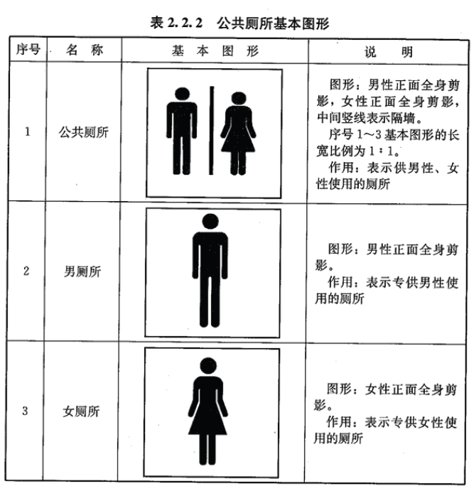按照標準CJJ/T 125-2008《環(huán)境衛(wèi)生圖形符號標準》,公廁相關的主要圖形如上圖所示。
