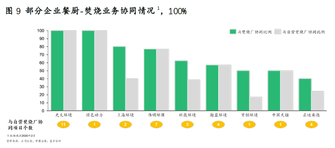 在垃圾分類全面推行的大背景下,這些大型固廢企業(yè)正利用協(xié)同優(yōu)勢(shì)降維打擊(見圖9)。一方面,垃圾焚燒主業(yè)帶給這些企業(yè)資金和政府資源雙重優(yōu)勢(shì);另一方面,協(xié)同處置帶來(lái)降本增效,可以幫助這些企業(yè)降低財(cái)務(wù)壓力:在收入端,協(xié)同優(yōu)勢(shì)在于餐廚沼渣余電上網(wǎng);而在成本端,除可節(jié)約土建、人工等成本外,干濕垃圾處置的發(fā)電設(shè)備、除臭系統(tǒng)、滲濾液處理系統(tǒng)、蒸汽供熱系統(tǒng)等也可共用,從而降低折舊攤銷成本。