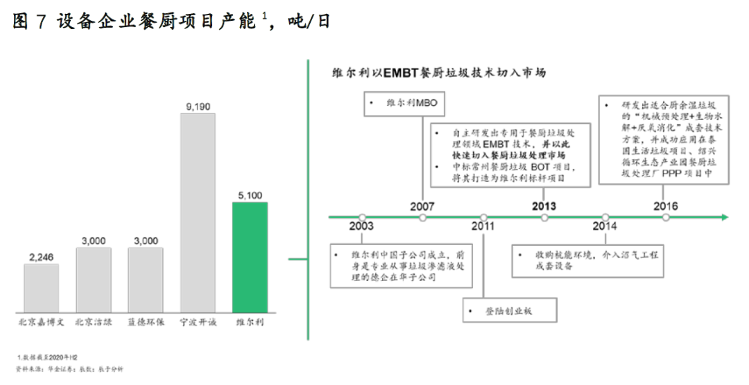 展望“十四五”,我們認(rèn)為有兩股力量不容忽視,餐廚垃圾處理行業(yè)真正激烈的市場(chǎng)競(jìng)爭(zhēng)也許才剛剛開始,一方是以寧波開誠(chéng)、維爾利為代表的企業(yè),他們進(jìn)入市場(chǎng)較早,主要提供技術(shù)或設(shè)備,同時(shí)具有一定的產(chǎn)能規(guī)模和先發(fā)品牌優(yōu)勢(shì)(見圖7)。