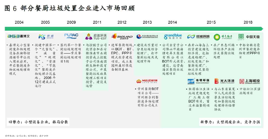 回顧我國(guó)餐廚垃圾處理行業(yè)的發(fā)展歷程,可以看到過(guò)去十幾年由于市場(chǎng)規(guī)模小、發(fā)展慢,并未引起足夠重視,主要是一些小型設(shè)備企業(yè)“小打小鬧”,市場(chǎng)比較分散,競(jìng)爭(zhēng)并不激烈。不過(guò)近幾年,隨著垃圾分類帶來(lái)的需求激增,包括光大環(huán)境、中國(guó)天楹、上海城投等大型固廢企業(yè)紛紛進(jìn)入,硝煙四起(見圖6)。