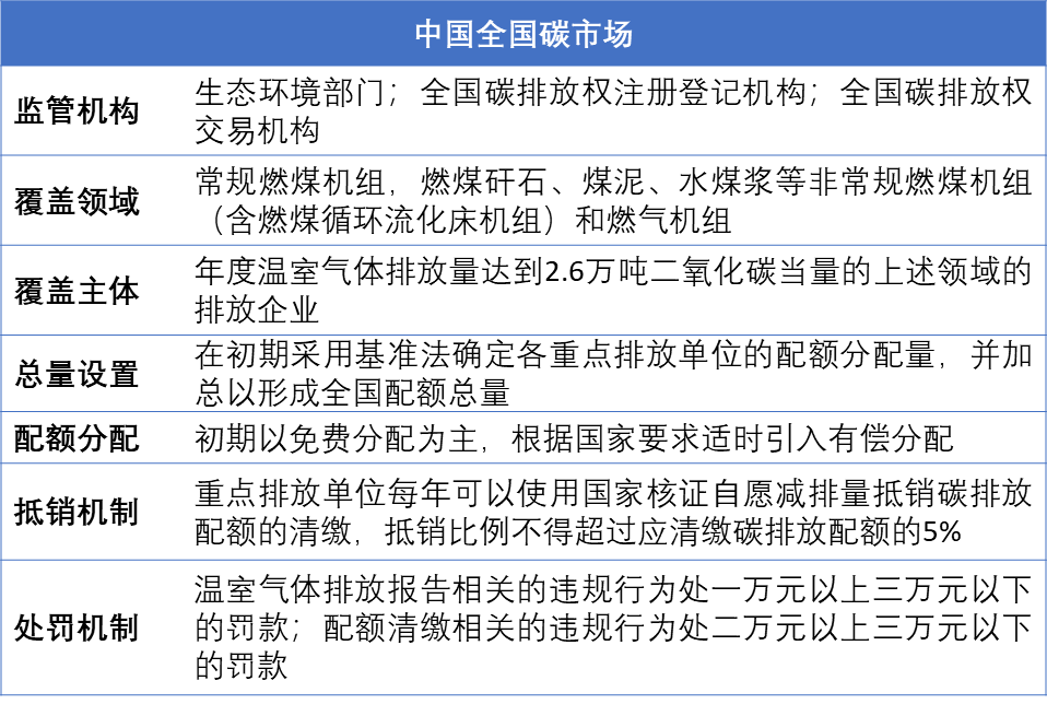 目前,中國的全國碳市場已經(jīng)進(jìn)入交易前的最后準(zhǔn)備階段。參考生態(tài)環(huán)境部發(fā)布的《2019-2020年全國碳排放權(quán)交易配額總量設(shè)定與分配實(shí)施方案(發(fā)電行業(yè))》、《碳排放權(quán)交易管理辦法(試行)》以及《碳排放權(quán)交易管理暫行條例(草案修改稿)》等文件,即將啟動的全國碳市場將以生態(tài)環(huán)境部門為主要監(jiān)管機(jī)構(gòu)、覆蓋范圍為化石能源發(fā)電及發(fā)熱行業(yè)的二氧化碳排放,在初期通過基準(zhǔn)法確定各重點(diǎn)排放單位的配額分配量,并加總以形成全國配額總量。此外,初期的配額分配將以免費(fèi)分配為主,同時允許以國家核證自愿減排量抵銷碳排放配額,抵消比例不得超過應(yīng)清繳碳排放配額的5%。相關(guān)的機(jī)制設(shè)計(jì)見下表: