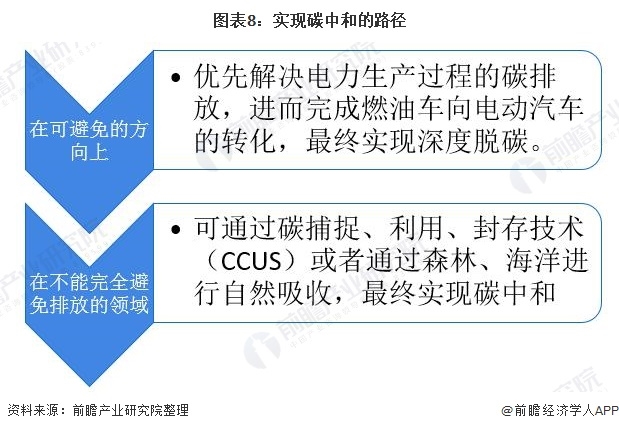 在可避免的方向上,國家提出優(yōu)先解決電力生產(chǎn)過程的碳排放,進而完成燃油車向電動汽車的轉(zhuǎn)化,最終實現(xiàn)深度脫碳。在不能完全避免排放的領(lǐng)域,可通過碳捕捉、利用、封存技術(shù)(CCUS)或者通過森林、海洋進行自然吸收,最終實現(xiàn)碳中和。