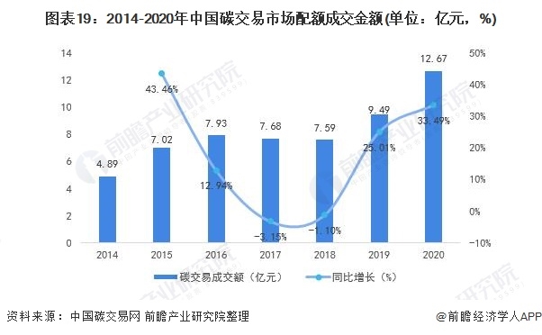 從我國碳交易市場的成交金額變化情況來看,2014-2020年我國碳交易市場成交額整體呈現(xiàn)增長趨勢,僅在2017、2018兩年有小幅度減少。2020年我國碳交易市場成交額達到了12.67億元人民幣,同比增長了33.49%,創(chuàng)下碳交易市場成交額新高。