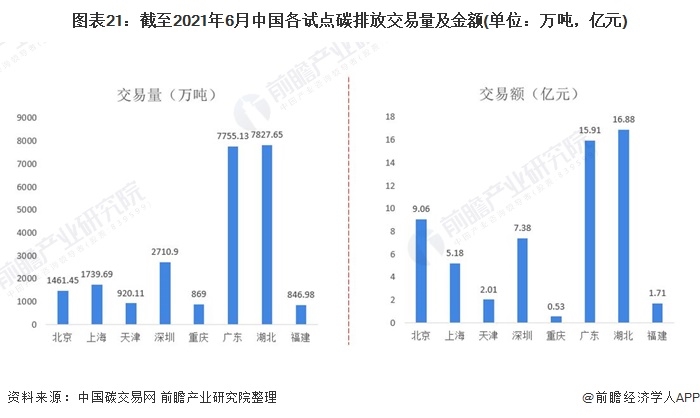 從各個試點地區(qū)的交易情況來看,湖北省和廣東省的碳交易中心的市場規(guī)模要遠超于其他地區(qū),其中湖北省的碳交易總量和碳交易總額都位列首位,分別為7827.65萬噸和16.88億元。在北京、上海、天津、深圳和重慶五個市內(nèi),北京和深圳的碳交易相對活躍,其中北京的碳交易額總共為9.06億元,深圳的碳交易總額共7.38億元。
