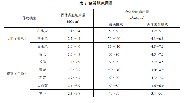 8.3 當(dāng)以施用畜禽養(yǎng)殖糞肥作為作物養(yǎng)分唯一來(lái)源時(shí),中等土壤肥力農(nóng)田的豬糞肥施用量按照表 2 的規(guī)定執(zhí)行。當(dāng)有條件進(jìn)行土壤肥力測(cè)試時(shí),施用量可按照不同土壤肥力水平進(jìn)行適當(dāng)調(diào)整。