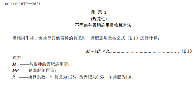 8.4 當(dāng)施用不同畜種糞肥時(shí),糞肥施用量應(yīng)按照附錄 B 中公式 B.1 進(jìn)行換算。