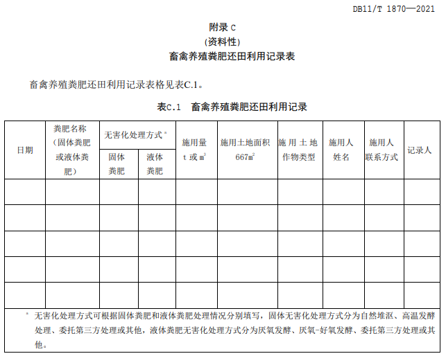 9.1 建立畜禽養(yǎng)殖糞肥還田利用臺(tái)賬記錄,記錄信息應(yīng)包括無(wú)害化處理情況、施用量、施用時(shí)間、施用方式、施用土地面積與施用者等內(nèi)容。臺(tái)賬記錄表格式見(jiàn)附錄 C。