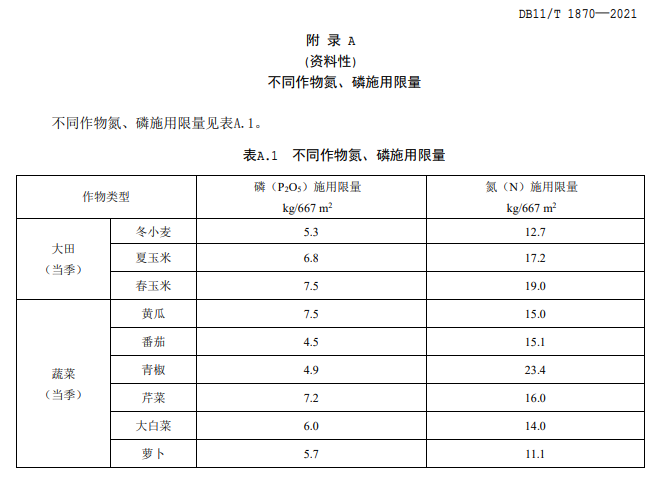8.2 固體糞肥施用以磷為限量依據(jù),氮素不足時(shí)補(bǔ)施氮肥;液體糞肥施用以氮為限量依據(jù),磷素不足時(shí)補(bǔ)施磷肥。氮、磷施用限量見(jiàn)附錄 A。