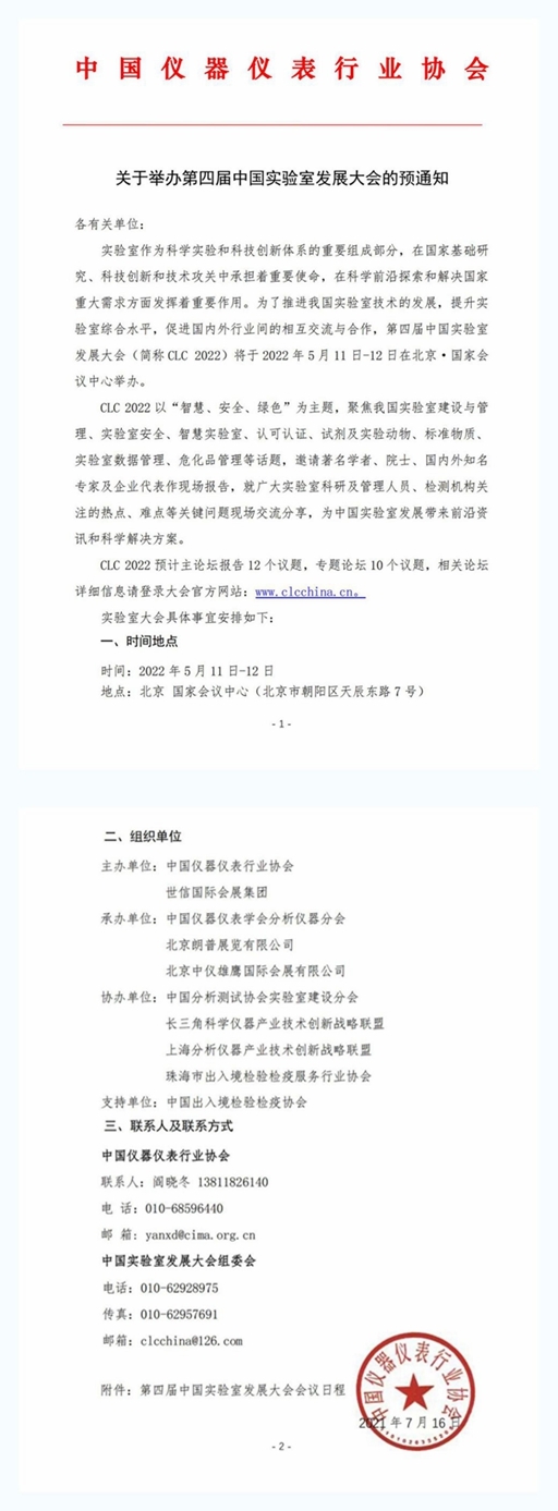 為了推進(jìn)我國(guó)實(shí)驗(yàn)室技術(shù)的發(fā)展,提升實(shí)驗(yàn)室綜合水平,促進(jìn)行業(yè)國(guó)內(nèi)外之間的相互交流與合作,一年一度的中國(guó)實(shí)驗(yàn)室發(fā)展大會(huì)即將于2022年5月11日-12日在北京·國(guó)家會(huì)議中心再度拉開(kāi)帷幕!《關(guān)于舉辦第四屆中國(guó)實(shí)驗(yàn)室發(fā)展大會(huì)的預(yù)通知》正式發(fā)布,敬請(qǐng)各位業(yè)內(nèi)工作者閱讀知曉: